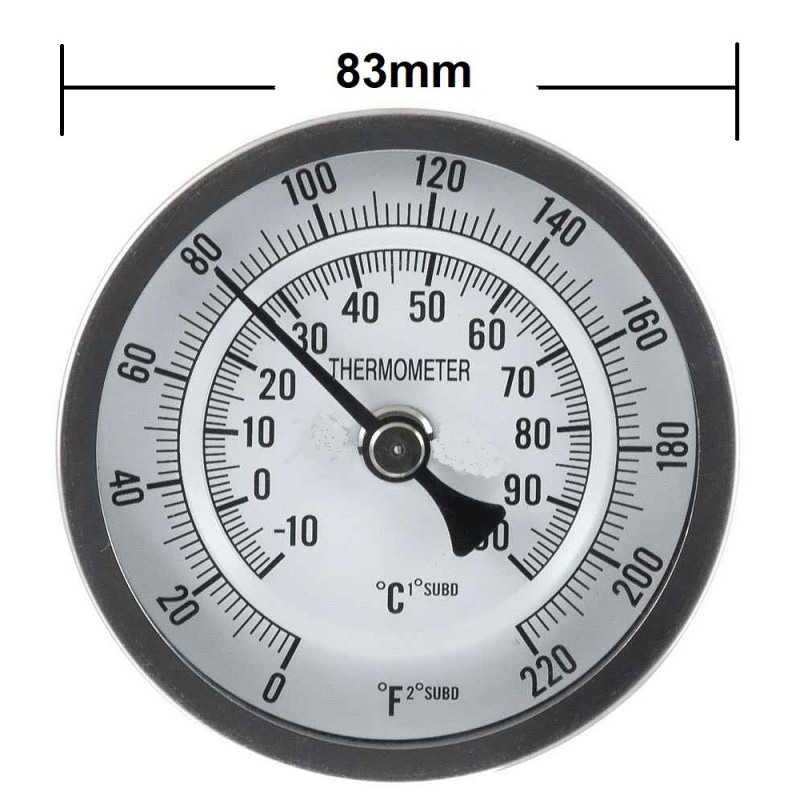 Temperatuurbereik: -15°C tot +120°C. in duidelijk leesbare 2 graden stappen . simpel te plaatsen in een aanwezige 1/2"draad-sok of je boort een gat in de wand van de pan of het vat en de thermometer kan zeer eenvoudig worden gemonteerd.