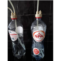 De eerste fles vul je tot de rand met water of een StarSan oplossing, oid. Draai de CO2-dop met slang erop. Tijdens de vergisting ontstaat druk, welke de vloeistof uit fles 1 drukt naar fles 2. De overtollige CO2 zal via fles 2 worden geloosd, net als bij een waterslot het geval is. Er blijft overdruk in het systeem.