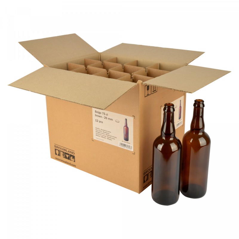 Robuuste kartonnen flessendoos met 12 Belge bierflessen van 75 cl. De vakverdeling in de doos beschermt de flessen tegen glasbreuk. Gebruik deze handige doos ook om jouw ambachtelijke creaties te stockeren.