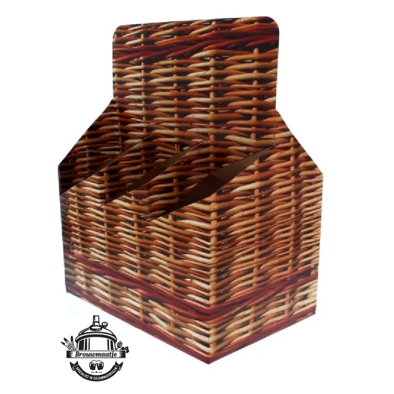 Flessendrager van karton - mandenvlechtmotief Stevige flessendrager voor 6 x 0,5 liter flessen van karton, bedrukt met motief
