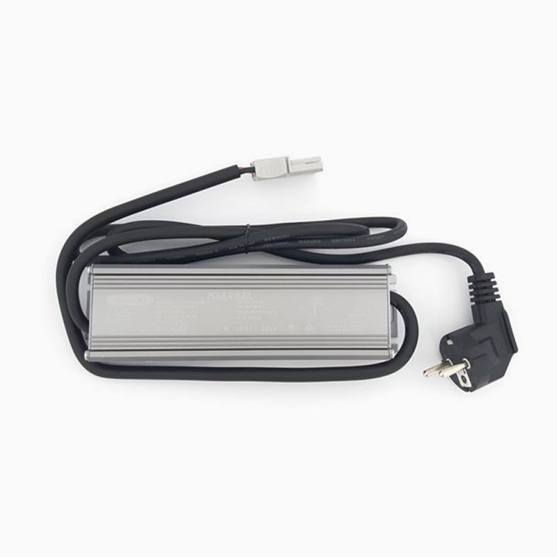 Stroomvoorziening voor de Cannular Semiautomatic Canning Machine. Het ene uiteinde is een Anderson-plug, die wordt aangesloten op de connector aan de achterkant van het apparaat. Het andere uiteinde is een 220 V-stekker voor gebruik met een standaard stopcontact.