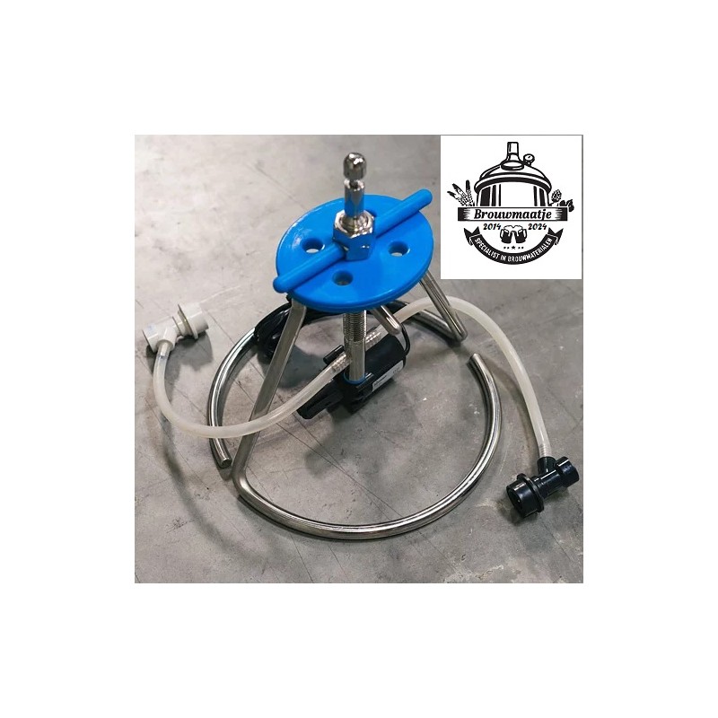Met de Ss Brewtech Keg WaSsher kunnen thuisbrouwers moeiteloos drukvaten als Cornelius kegs (Corny kegs of vergelijkbare varianten) reinigen. Dat gaat als volgt: verwijder het deksel van het vat, steek de sproeikopbevestiging schuin door de dekselopening en draai het vat zo dat de rand stevig tegen de siliconenafdichting aan de onderkant van de WaSsher aan zit. Druk het geheel stevig aan en draai de contramoer vast. Bevestig de twee snelkoppelingen met bolsluiting op de aansluiting “gas in” resp. de aansluiting “vloeistof uit”. Let er daarbij op dat er geen knikken in de siliconenslang zitten. Draai het fust tot slot ondersteboven en zet het geheel in een standaardemmer van 20 liter met ca. 8 liter van een reinigingsmiddel naar keuze. Schakel vervolgens de pomp in. Neem een biertje, relax en laat de Keg WaSsher zijn werk doen.