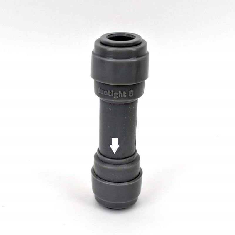 Deze koppeling van Duotight is ontworpen om maar in 1 richting gassen of heldere vloeistoffen door te laten. 1 PSI druk volstaat reeds om de interne klep te openen.