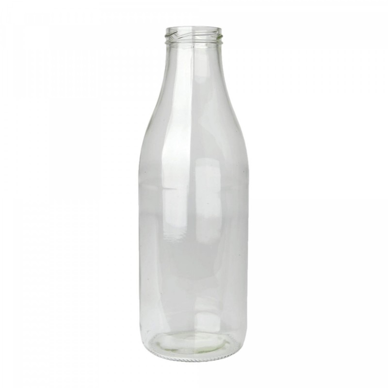 Transparante melk- of sapfles, inhoud 1 liter, zonder deksel (twist-off 48 mm).