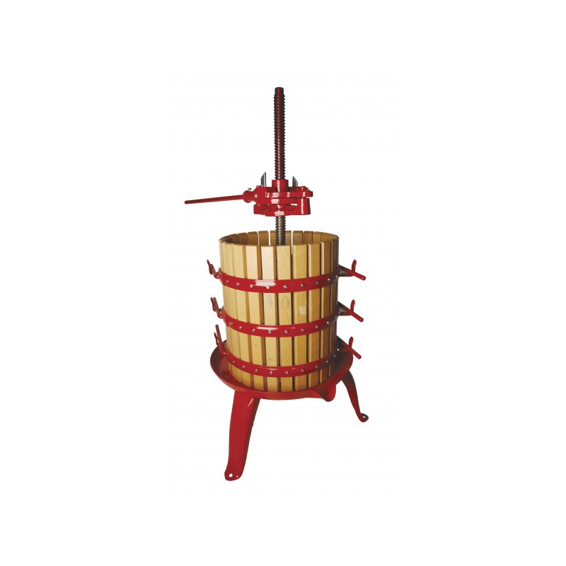 Fruitpersen met gelakte ijzeren voet. Met vaste centrale vijzel. Dubbel, horizontaal perssysteem (ratelmechanisme). Korfmantel in beukenhout. De budgetvriendelijke fruitpers voor de beginnende wijnmaker.