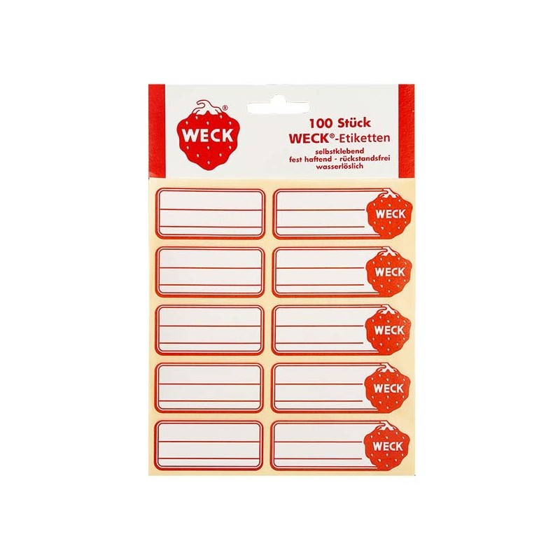 • Een verpakking bevat 100 zelfklevende etiketten, 50 standaard etiketten en 50 etiketten met Weck-aardbei.