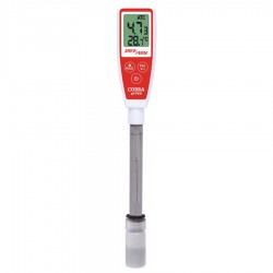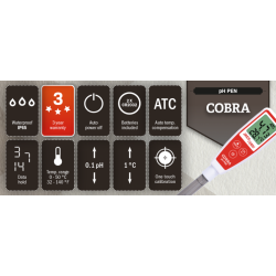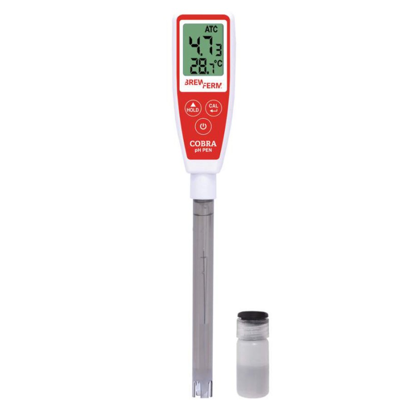 De Brewferm Cobra is een complete pH-pen met een onnavolgbare prijs-kwaliteitverhouding. De temperatuur van de vloeistof kan afgelezen worden tot op 0,1 °C en de pH tot op 0,01. Daarnaast is de pH-meter IP65 waterproof, hij kan dus probleemloos onder de kraan afgespoeld worden. Door de pen-vorm is de pH-meter uitermate geschikt om in smalle recipiënten te gebruiken.