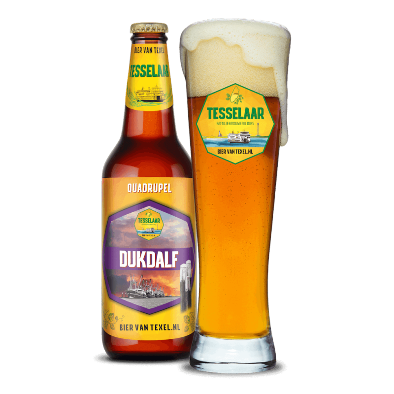 Tesselaar Dukdalf is een stoer krachtig bier van 10% Alc. vol. Een echte Quadrupel! De rijke donkerkopere kleur ontstaat door een variatie aan geroosterde gerst en mout soorten. Vol van smaak, met prachtige moutbittertonen gecombineerd met een zachte hopbitter door de bijzondere Marynka hop. Een klein zoetje maakt een fluweelzachte afdronk!